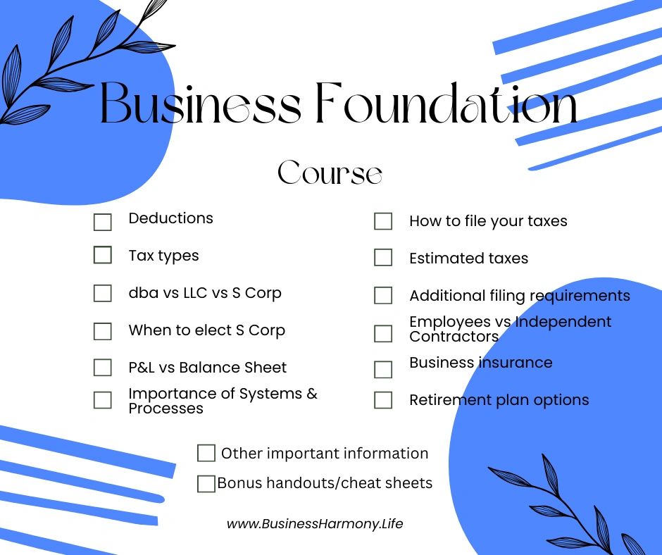 We will also go over retirement plan options (it's never too early to start planning for this), insurance needed for your business, important deadlines, records to keep, how to pay yourself, and provide you with additional resources and software options.